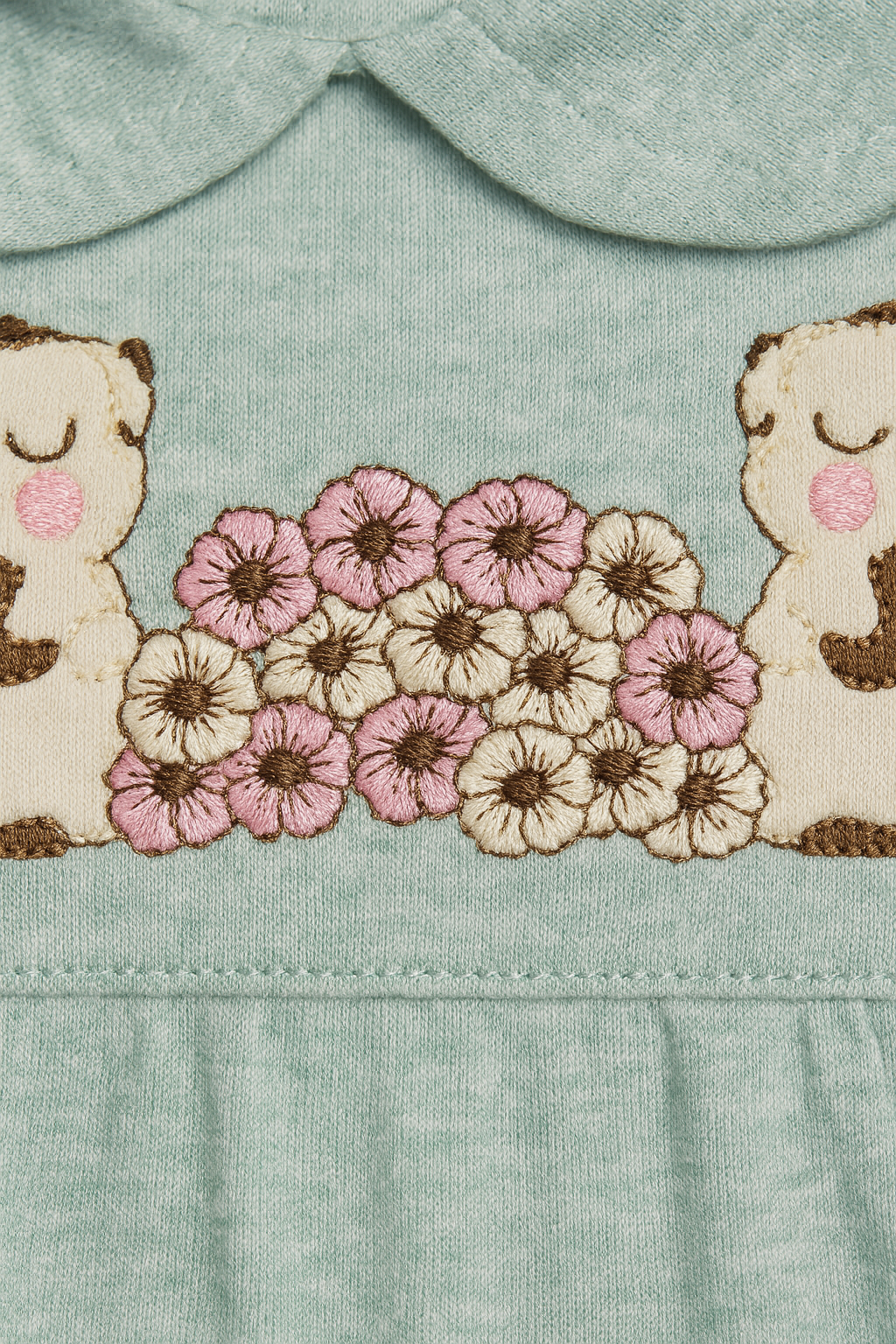The Blush Bunnies Romper combines sweetness and softness in a beautifully detailed one-piece outfit. Crafted from 100% cotton, this mint green romper features adorable embroidered bunnies and delicate pink flowers across the chest. With flutter sleeves, a Peter Pan collar, and back snap buttons for easy dressing, it's both charming and practical. Lightweight and breathable, it's perfect for sunny days, playdates, or casual outings.